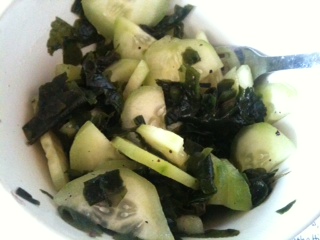 Mix the cucumber with the drained seaweed and the smoked salmon, if using. Whisk up a splash of rice vinegar, a drizzle of toasted sesame oil, a pinch of sugar, black pepper and some shoyu (Japanese soy sauce) to taste.